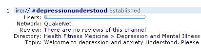 Trivia Quiz > Connection Troubleshooting ThreeStep ThreeWe are sorry that we have been unable to resolve your connection problems up to this point. This final step will link you to an external site (searchirc.com) that will also attempt to connect you to this quiz room. Seachirc.com will list the trivia room by its full name. Please click on this rooms' name as highlighted in blue in the example below for the room "depressionunderstood".